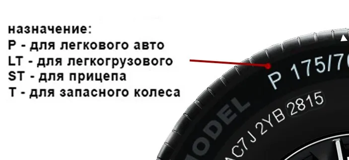 Изменение в назначении, размещаемом перед типом и размером -P 175/70 R 13 (P - легковой транспорт, 175 мм - ширина профиля, 70% - высота, R - радикальный корд, 13 - размер диска в дюймах).