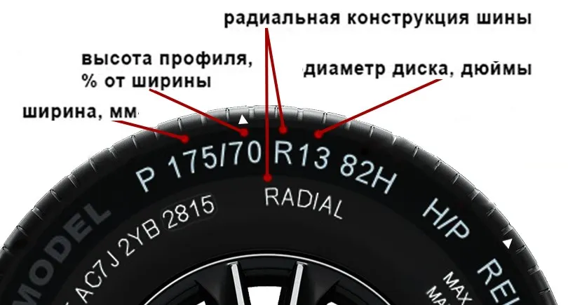 Например, аббревиатура, связанная с размером, может иметь следующий вид: 175/70 R 13, где 175 — ширина, 70% — высота, тип конструкции шины радиальный, диаметр — 13 дюймов.